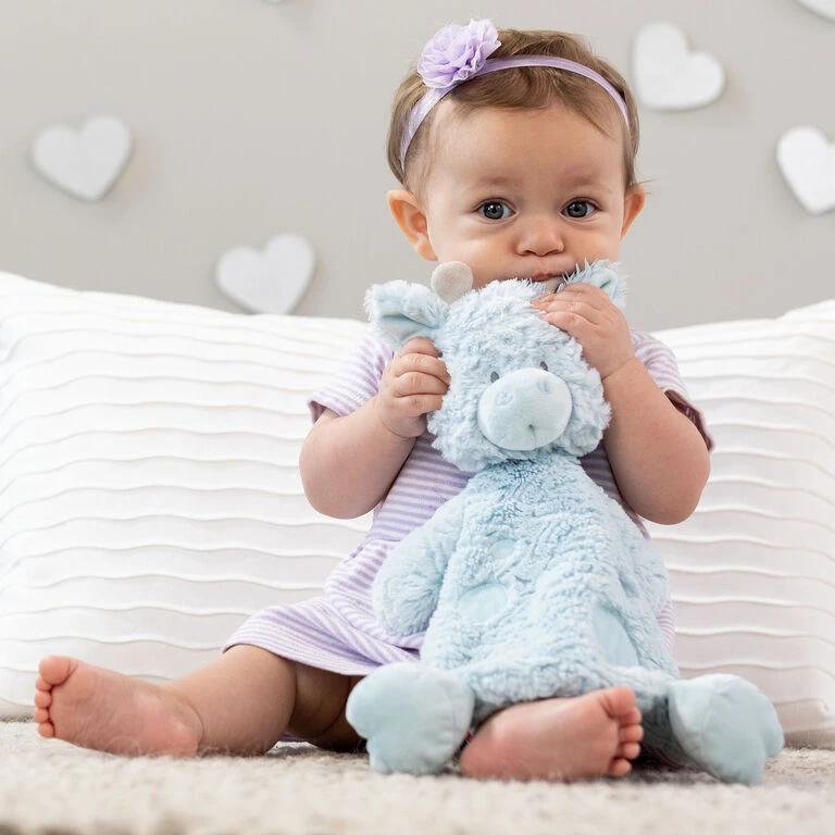 Give baby a gift that charms and soothes with this cute blue giraffe rattle blankie from Demdaco. Sweet security blankie with a giraffe head features a soft, plush blue fabric body and a rattle for a unique toy and blanket in one. Soft, snuggly baby blanket makes a great baby shower gift for expecting parents.