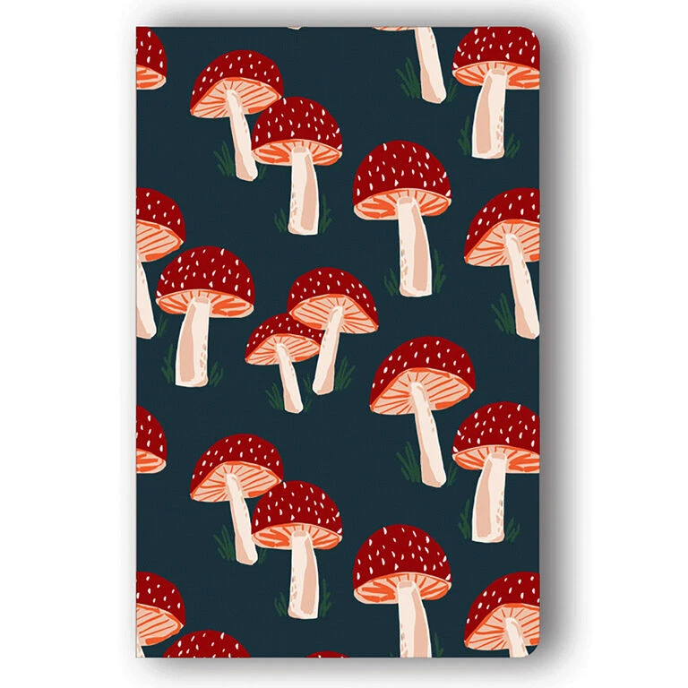 - Classic layflat notebook features a durable, velvety-smooth cover with a scattered mushroom pattern.