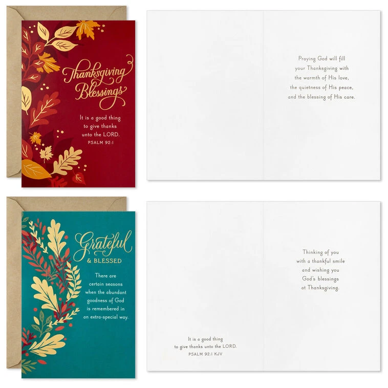 Leaves on teal design: Grateful and Blessed. There are certain seasons when the abundant goodness of God is remembered in an extra special way.; Thinking of you with a thankful smile and wishing you God’s blessings at Thanksgiving. / It is a good thing to give thanks unto the Lord. Psalm 92:1 KJV