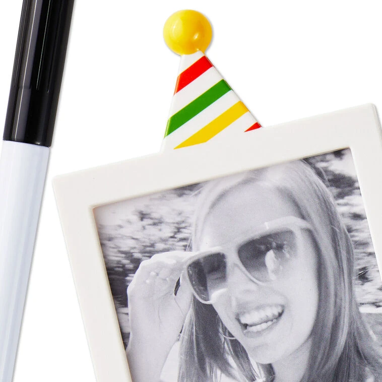 Doodle on happy birthday wishes, cartoon characters, smiley faces and more on a birthday cake with this fun cake topper. White plastic frame in vintage Polaroid picture style features a colorful striped party hat on top and coordinating stripes on the stakes. A dry-erase marker, included, lets you add your special message or drawing for the recipient that you can wipe off at the end of the celebration and reuse the topper another day.