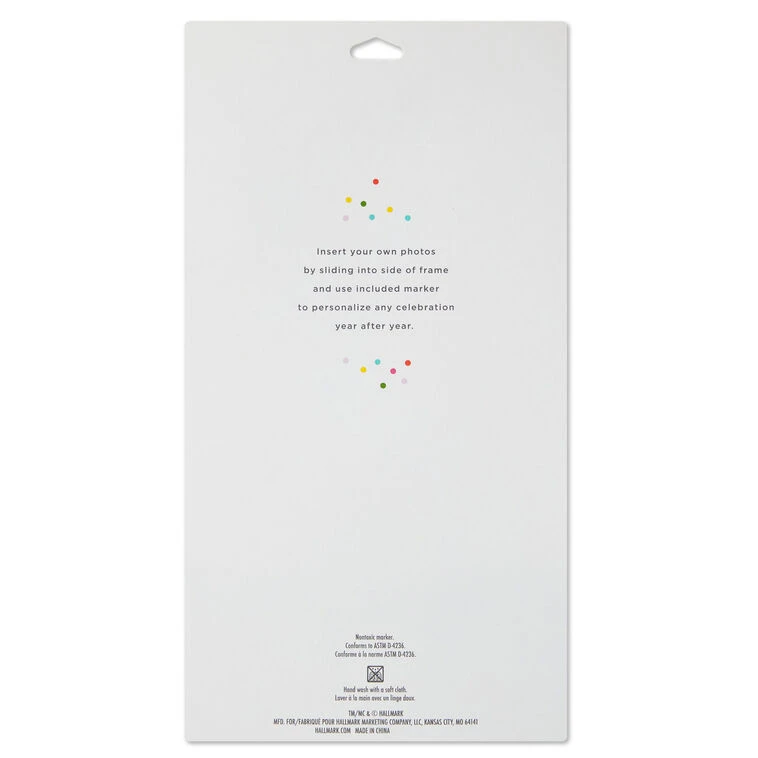 - Plastic cake topper frame with party hat includes a dry erase marker.