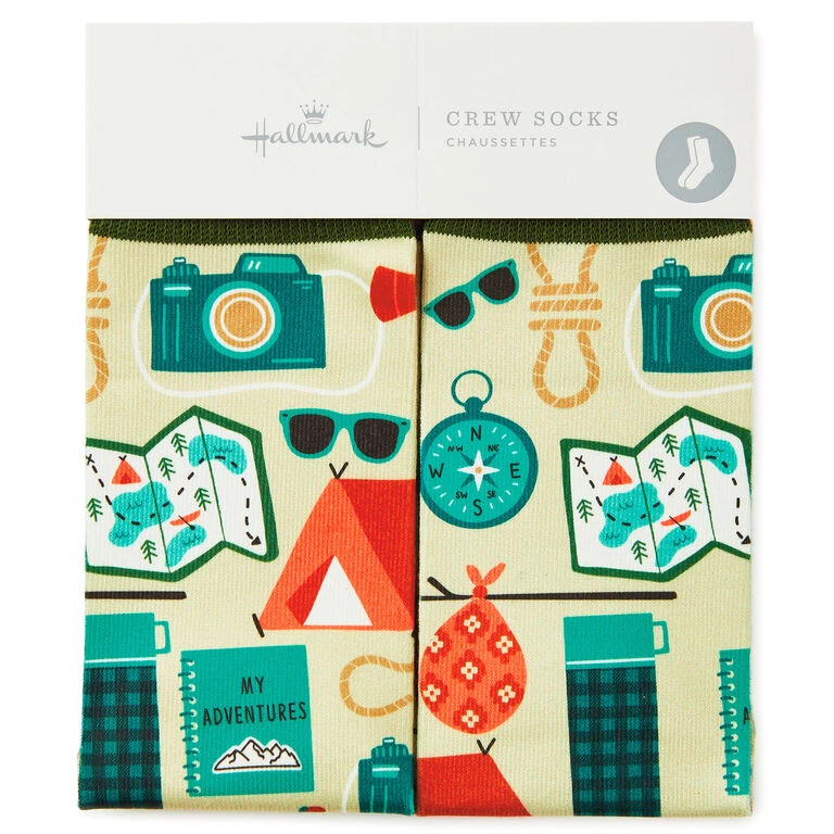 Proudly display your love of camping with this neutral-colored pair of socks that’s perfect for someone outdoorsy. Fun footwear features camping icons including a map, tent, compass, thermos, bike and more. One size fits most adult-sized feet.