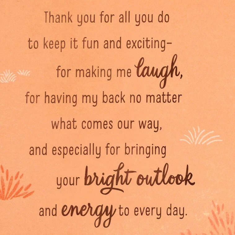 Thank you for all you do to keep it fun and exciting—for making me laugh, for having my back no matter what comes our way, and especially for bringing your bright outlook and energy to every day. I love you, and I love this journey we’re on!