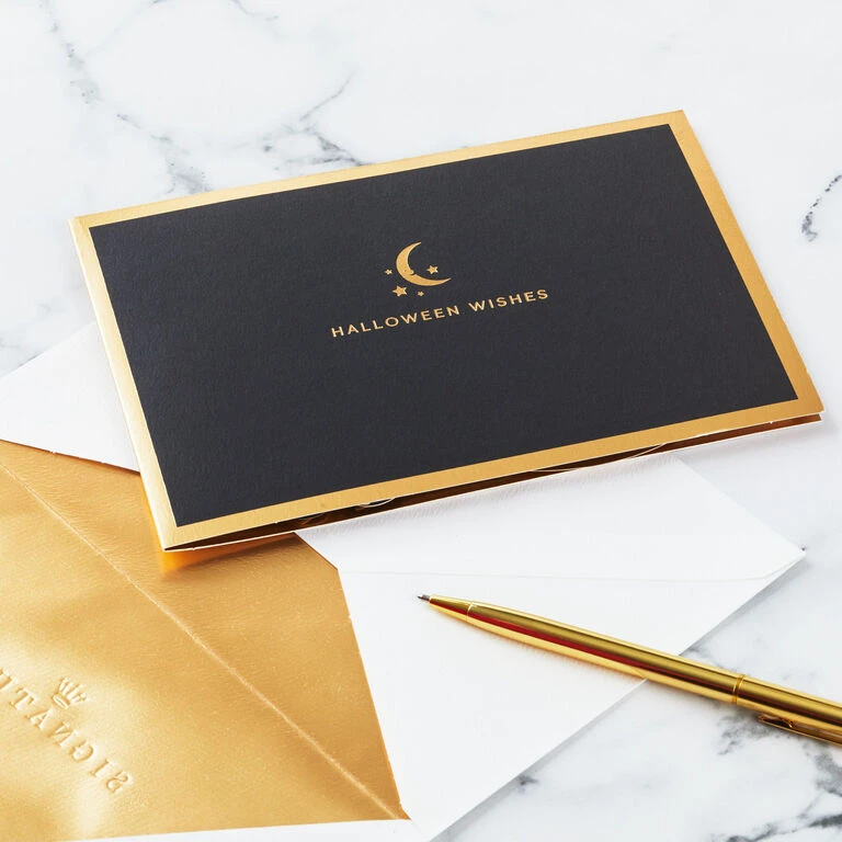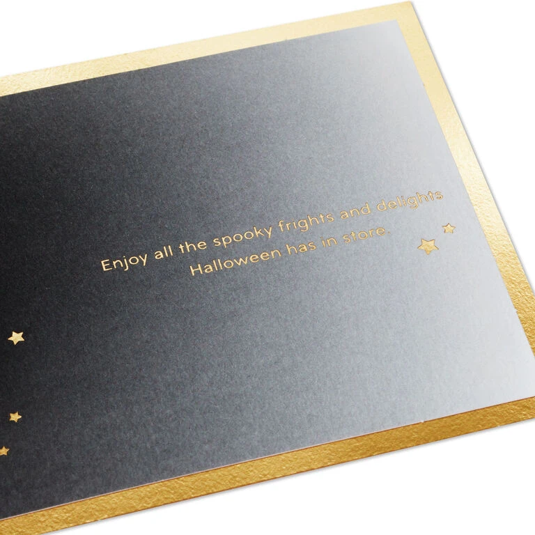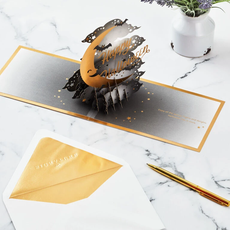 Pop-up Halloween greeting card features a crescent moon and stars with gold foil accents paired with Halloween wishes and gold foil border on the front. Simply open the card to reveal the 3D pop-up surprise inside—no assembly required: an intricate, laser-cut scene of a smiling crescent moon in the night sky along with clouds, stars and bats pops out. Gold foil accents add a shiny touch to the inside of the card. This Halloween card crafted from premium card stock is a work of art sure to be displayed all season long, making it an unforgettable way to share happy Halloween wishes with friends and family members. When open, card lays flat for display; 3D pop-up inside measures approx. 5.75″ H.