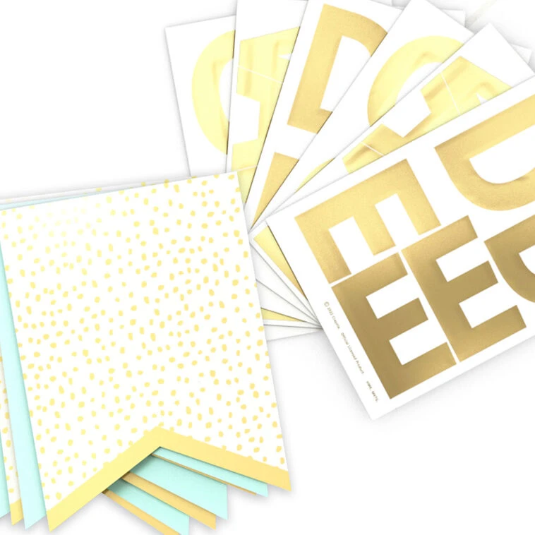 - Customizable banner kit includes 15 individual panels, 70 gold foil alphabet stickers and 4 yards of twine.
