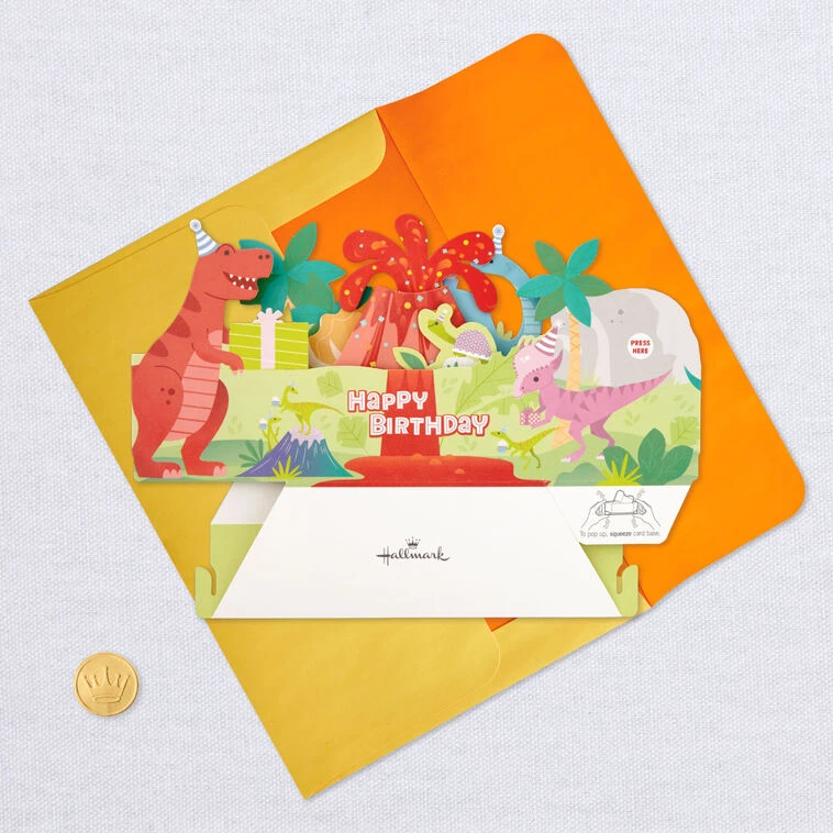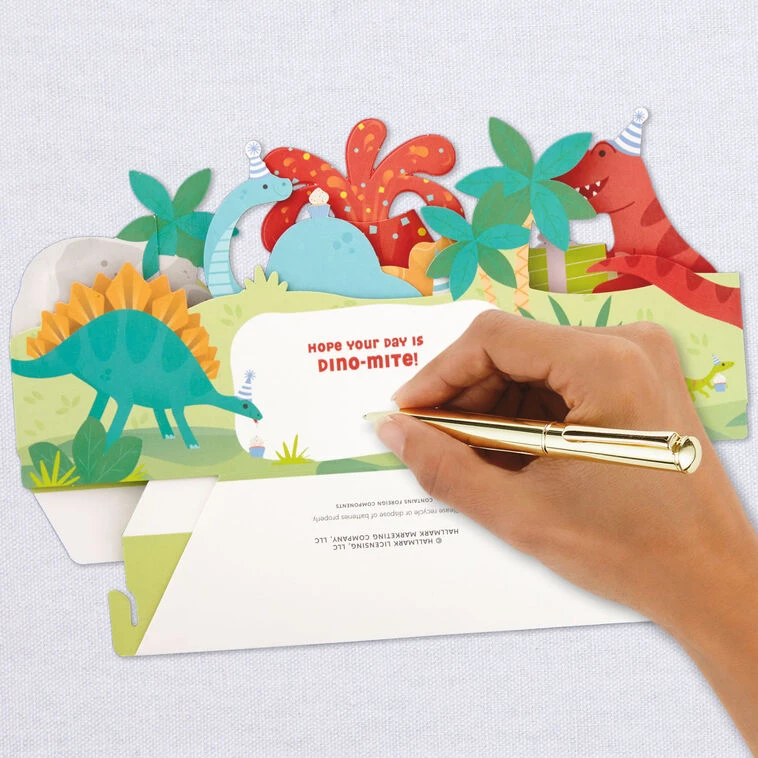 Card plays dinosaur sounds and a fun instrumental version of the “Happy Birthday” song.