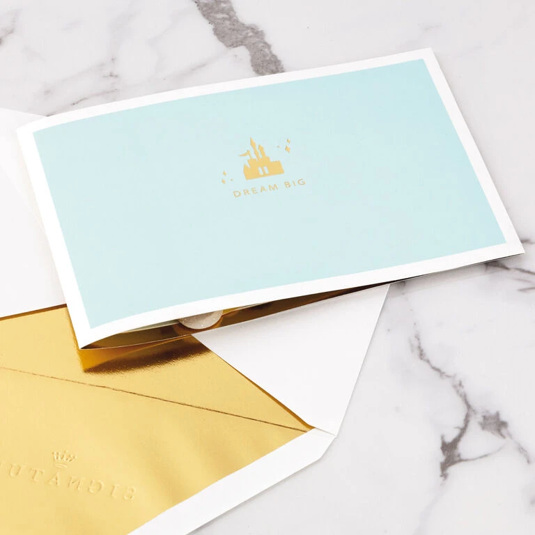 Pop-up greeting card features a castle icon and “Dream Big” message in gold foil on the front. Simply open the card to reveal the 3D pop-up surprise inside—no assembly required: an intricate, laser-cut castle pops out surrounded by Cinderella, Belle, Ariel, Jasmine and puffy white clouds. Glittery swirls and gold foil accents add a pretty touch to the Disney Princess design. This exquisite card crafted from premium card stock is a work of art sure to be displayed all year long, making it an unforgettable way to share a message of love with a special kid or Disney fan on their birthday, graduation or just because. When open, this pop-up card lays flat for display; 3D pop-up inside measures approx. 5.25″ tall.