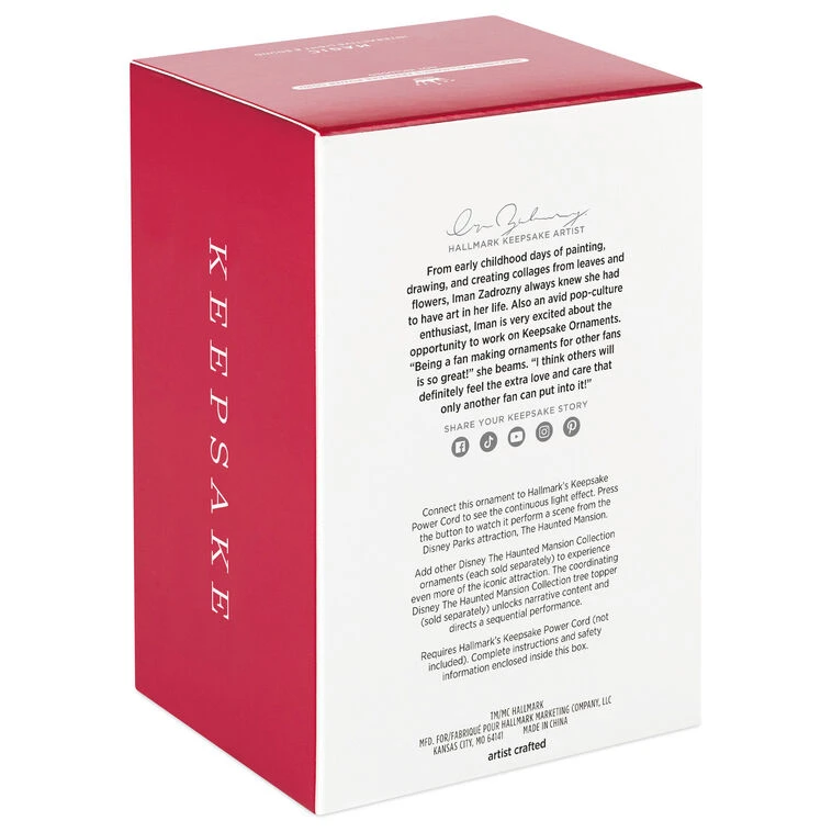 Connect the Interactive Light and Sound ornament to Hallmark’s Keepsake Power Cord (sold separately) to see a continuous light effect. Press the value to watch it perform a scene. Add other Disney The Haunted Mansion Collection ornaments (each sold separately) to experience even more of the iconic attraction. The coordinating Disney The Haunted Mansion Collection tree topper (sold separately) unlocks narrative content and directs a sequential performance.