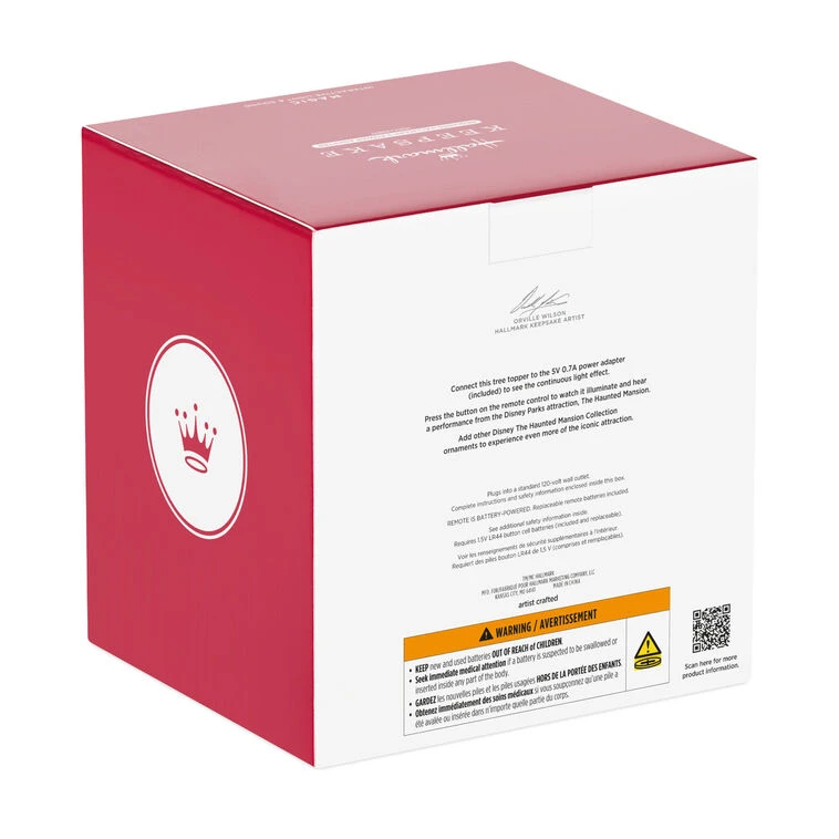 Connect the Interactive Light and Sound Christmas tree topper to the power adapter (included) to see a continuous light effect. Press the value on the remote control to watch the tree topper illuminate and hear music and sound. Add other Disney The Haunted Mansion Collection ornaments (each sold separately) to experience even more of the iconic attraction.