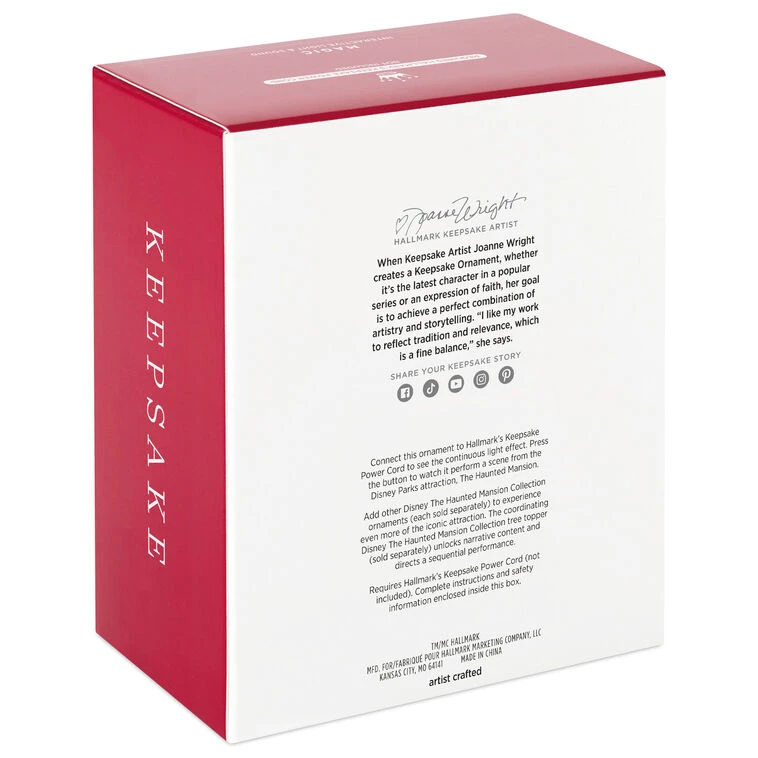 Connect the Interactive Light and Sound ornament to Hallmark’s Keepsake Power Cord (sold separately) to see a continuous light effect. Press the value to watch it perform a scene. Add other Disney The Haunted Mansion Collection ornaments (each sold separately) to experience even more of the iconic attraction. The coordinating Disney The Haunted Mansion Collection tree topper (sold separately) unlocks narrative content and directs a sequential performance.