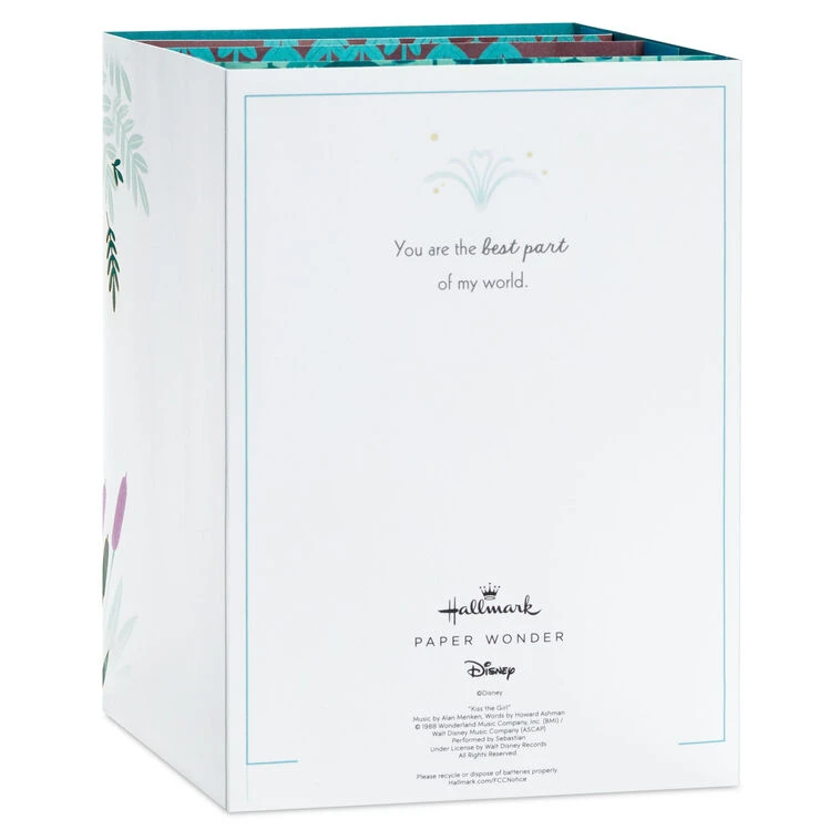 Musical card plays the song “Kiss the Girl” performed by Sebastian as it lights up.