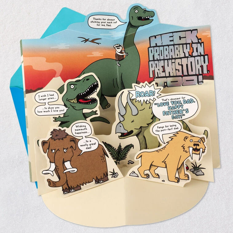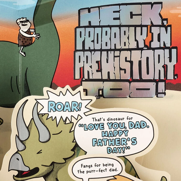 Heck probably in prehistory too! Thanks for always sticking your neck out for me, Dad. I wish I had longer arms…to show you how much I love you! Wishing mammoth happiness…to a woolly great dad! Fangs for being the purr-fect dad. Roar! That’s dinosaur for “Love you, Dad. Happy Father’s Day!”