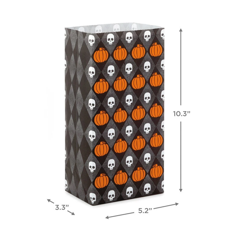 Share all treats, no tricks, with these spooky Halloween paper treat sacks. Multipack of 30 goodie bags includes two different but coordinating designs: ghosts on black and orange diamonds, and pumpkins and skulls on gray and black diamonds. They’re the perfect way to give party favors at Halloween parties or to share with trick-or-treaters on Halloween night.