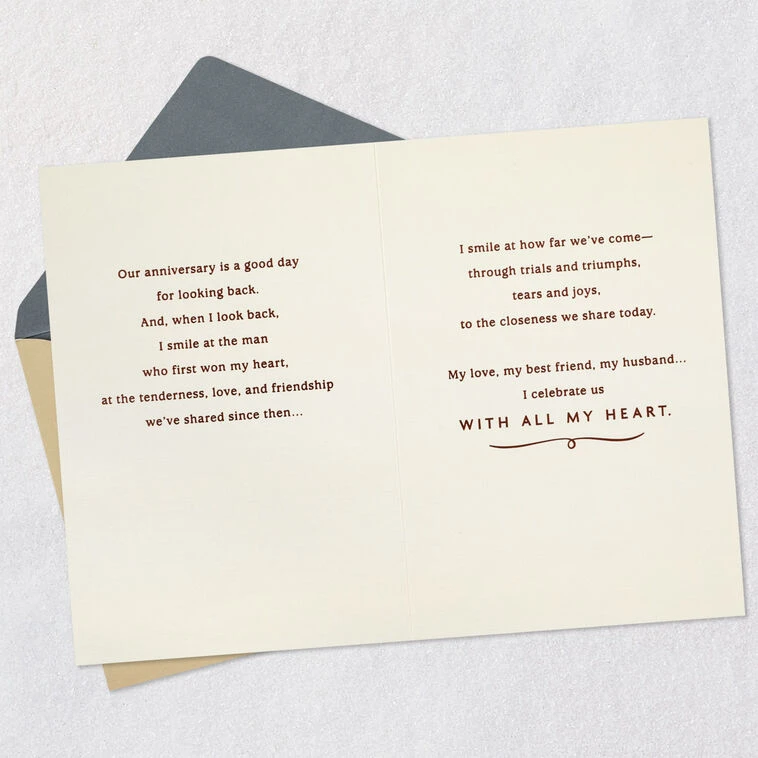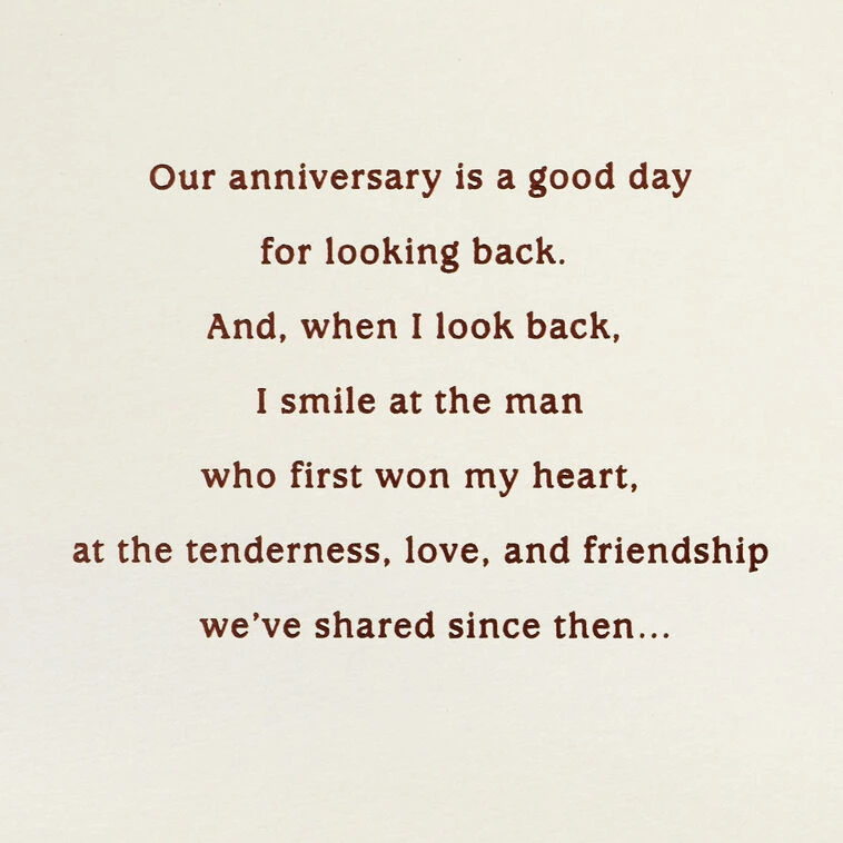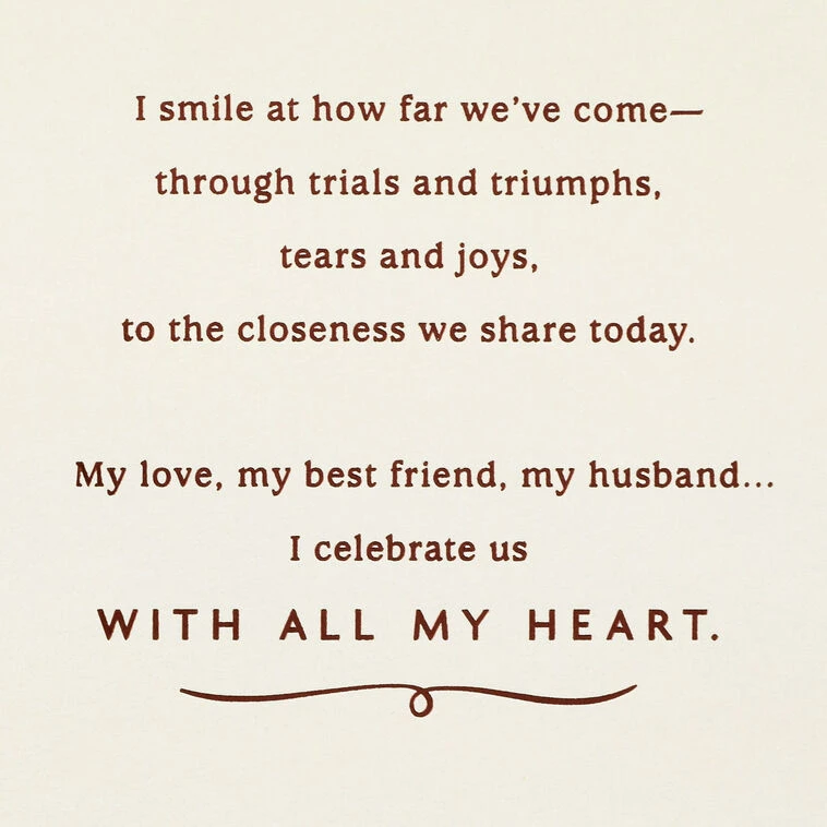 Our anniversary is a good day for looking back. And, when I look back, I smile at the man who first won my heart, at the tenderness, love, and friendship we’ve shared since then… I smile at how far we’ve comeāthrough trials and triumphs, tears and joys, to the closeness we share today. My love, my best friend, my husband… I celebrate us with all my heart.