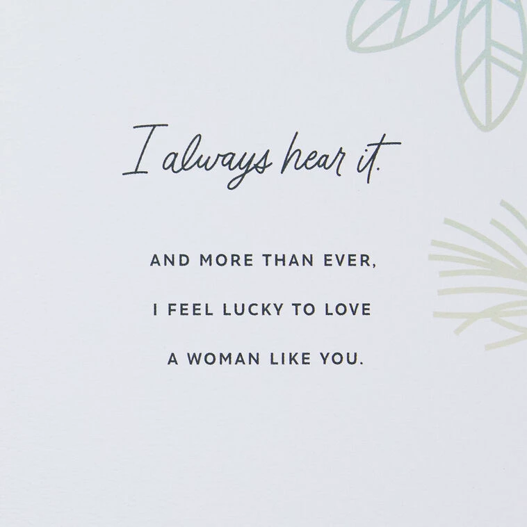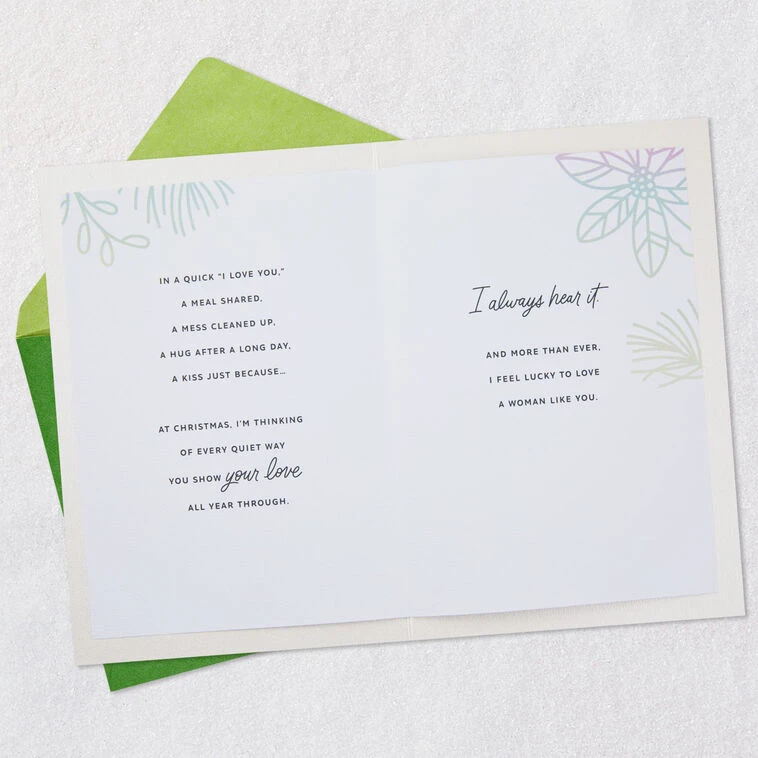 In a quick “I love you,” a meal shared, a mess cleaned up, a hug after a long day, a kiss just because…At Christmas, I’m thinking of every quiet way you show your love all year through. I always hear it. And more than ever, I feel lucky to love a woman like you.