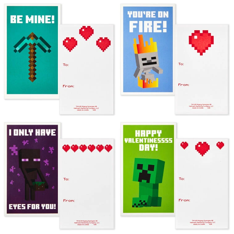 Iron pickaxe teacher card design: Thanks for helping me through creative mode!; Inside: Happy Valentine’s Day.