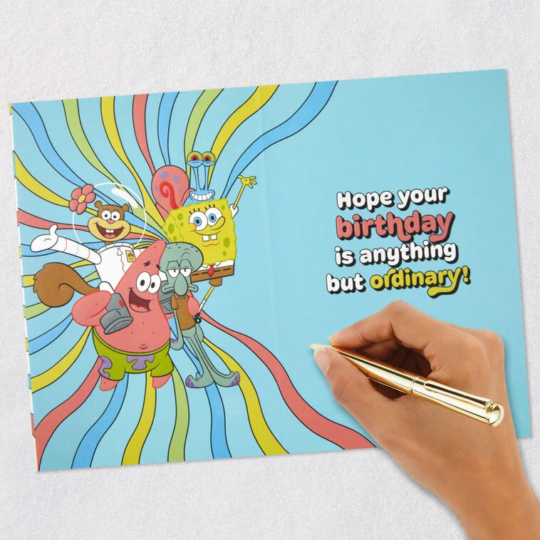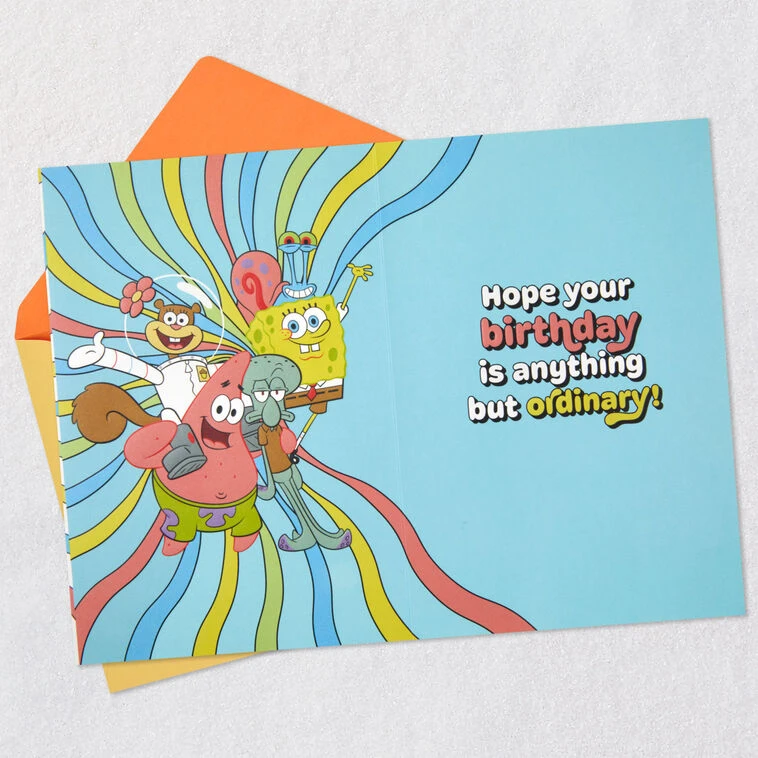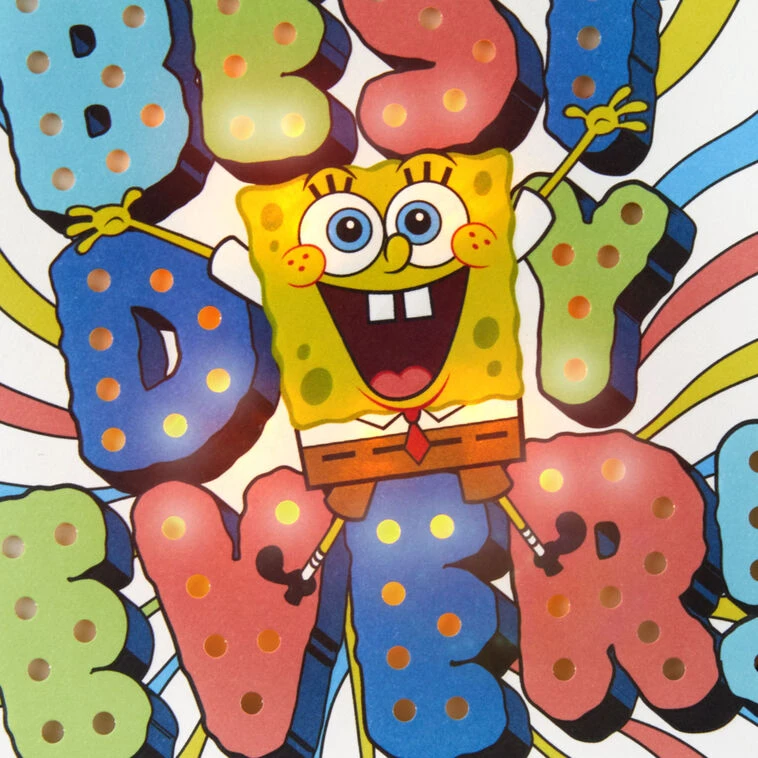 Musical card plays a “SpongeBob SquarePants” television theme song-inspired version of the “Happy Birthday” song and lights up.