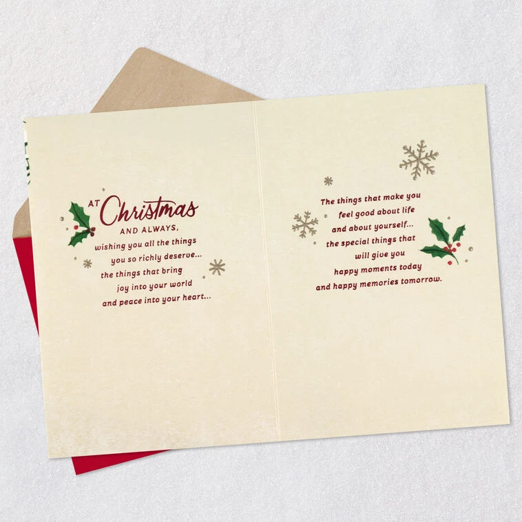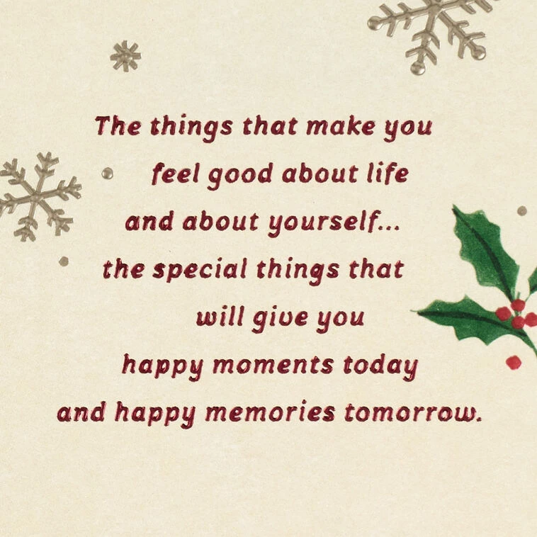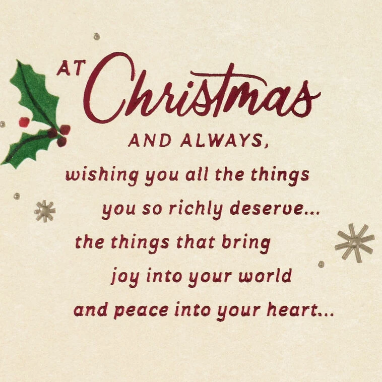 At Christmas and always, wishing you all the things you so richly deserve…the things that bring joy into your world and peace into your heart…The things that make you feel good about life and about yourself…the special things that will give you happy moments today and happy memories tomorrow.