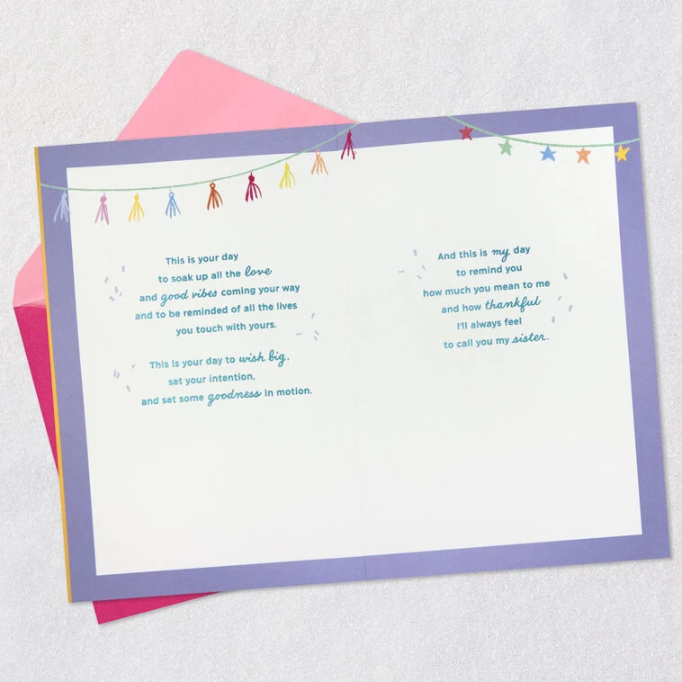 This is your day to soak up all the love and good vibes coming your way and to be reminded of all the lives you touch with yours. This is your day to wish big, set your intention, and set some goodness in motion. And this is my day to remind you how much you mean to me and how thankful I’ll always feel to call you my sister.