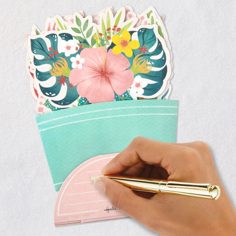 Simply pull down on sides of the pop-up card and push up base to pop it open and lock into place for displayāno assembly required.