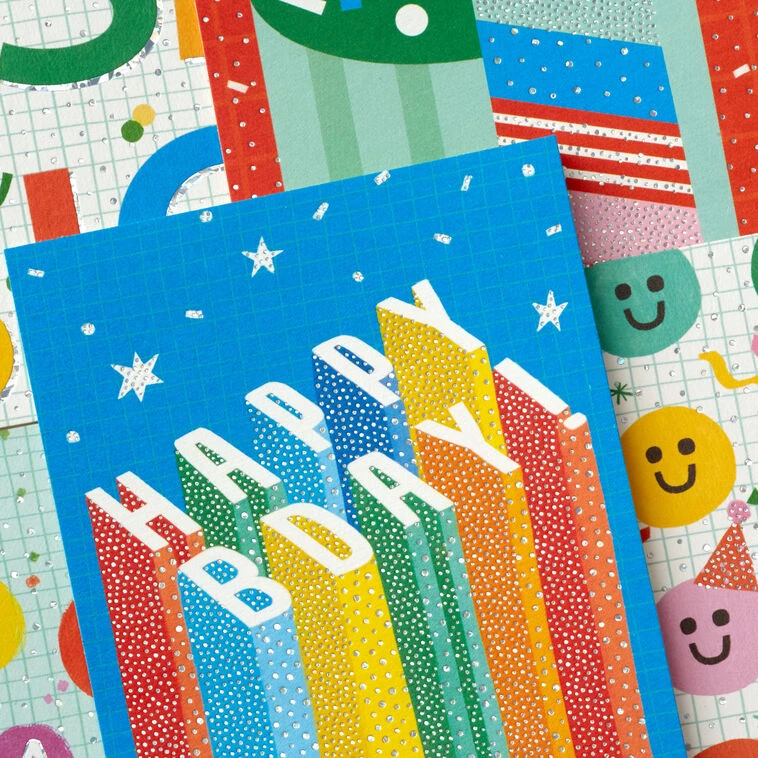 Shooting stars design: Happy Bday! / Confetti on grid design: Wish big / Squiggles on green design: Best day ever / Balloons design: Hooray! Let’s party / Cake design: Yay