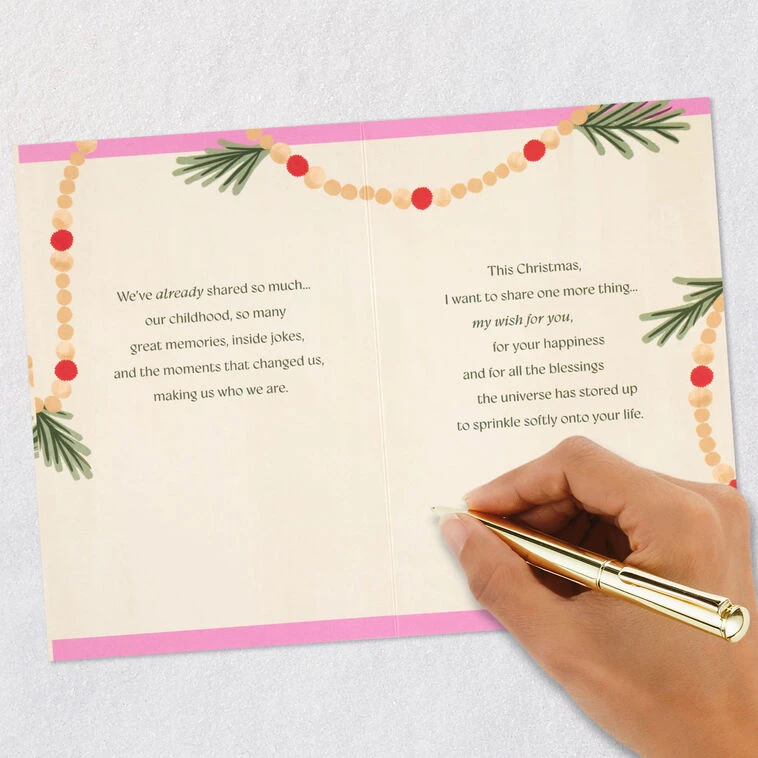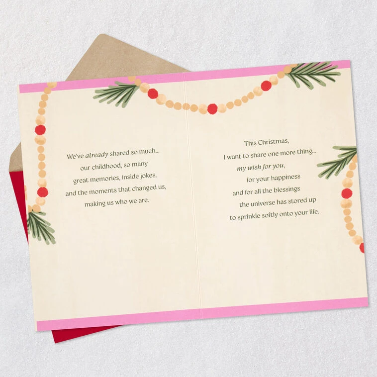 We’ve already shared so much…our childhood, so many great memories, inside jokes, and the moments that changed us, making us who we are. This Christmas, I want to share one more thing…my wish for you, for your happiness and for all the blessings the universe has stored up to sprinkle softly onto your life.