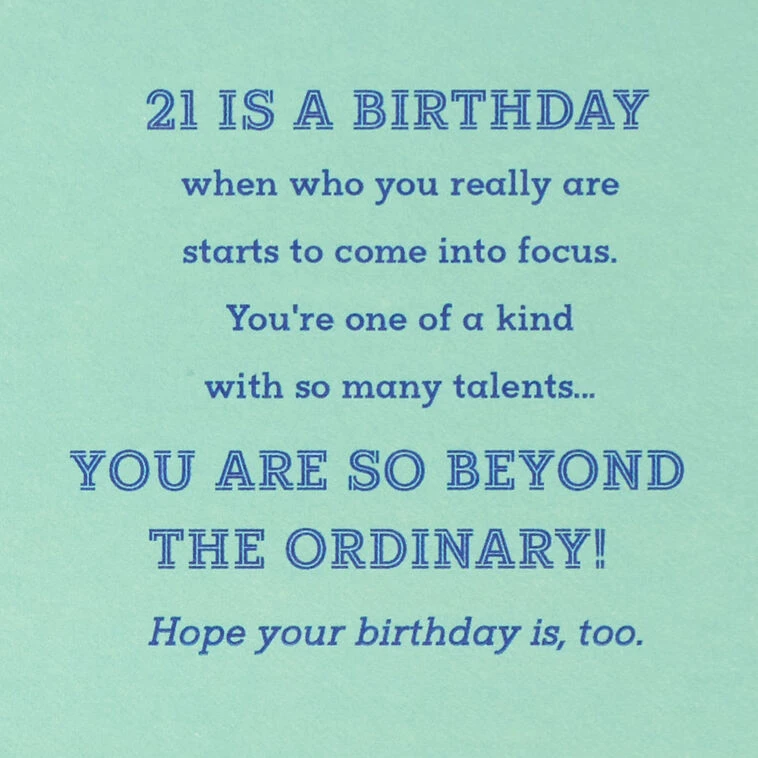 21 is a birthday when who you really are starts to come into focus. You’re one of a kind with so many talents…You are so beyond the ordinary! Hope your birthday is, too.