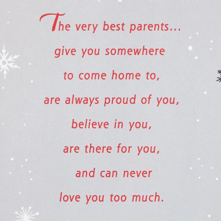 The very best parents…give you somewhere to come home to, are always proud of you, believe in you, are there for you, and can never love you too much. The very best parents are the only kind you two know how to be. Merry Christmas