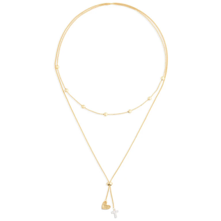 Faith and love, two of the things that matter most, are showcased in this pretty layered necklace that features a dangling gold metal heart charm and silver metal cross charm. Brass design with beaded shorter chain and adjustable-length charms make this piece of jewelry a beautiful way to accessorize your look. Gift packaged with a message that lets the recipient know how much they mean to you.