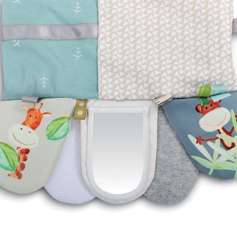 - Fabric activity scarf is designed to hang around mom’s neck to promote together time with baby.