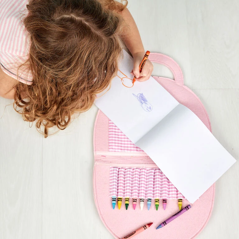 Encourage their artistic imagination with this on-the-go art case for kids. The felt folio features a sparkly rainbow on the outside and a hook-and-loop tape closure. Perfectly sized for kids to take along on car rides, errands or appointments, the soft activity case includes pockets for a drawing pad and crayons inside (both included).