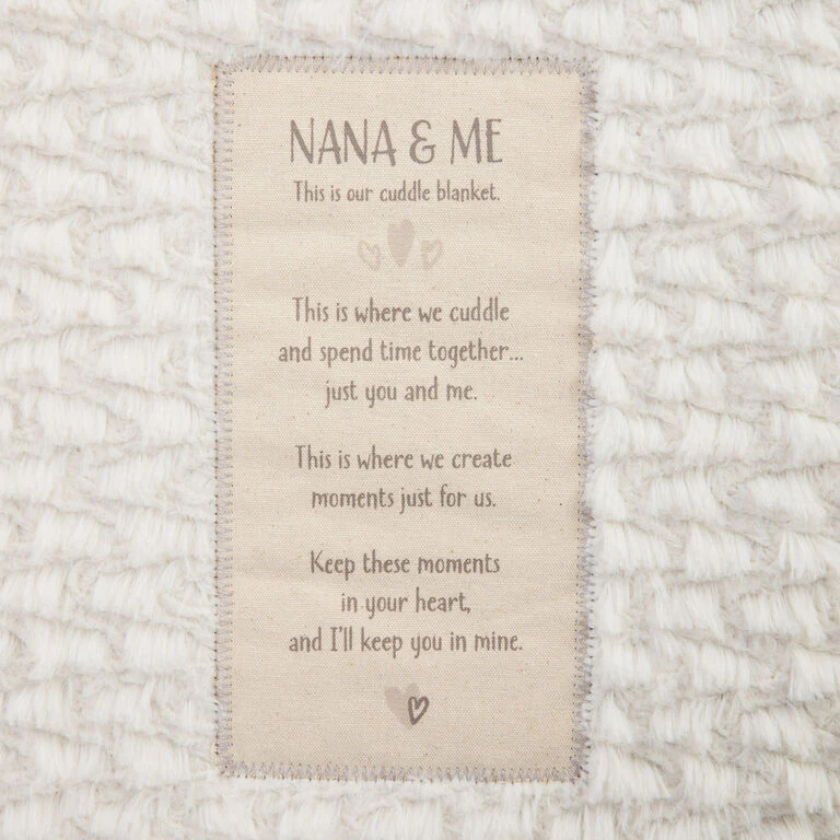 The beautiful Nana and Me Cuddle Blanket is a wonderful gift for any little one or new grandma. This super-soft, oversized cream and gray blanket features a sewn-in patch with a sentiment about the joys of spending warm and snuggly moments with your nana.