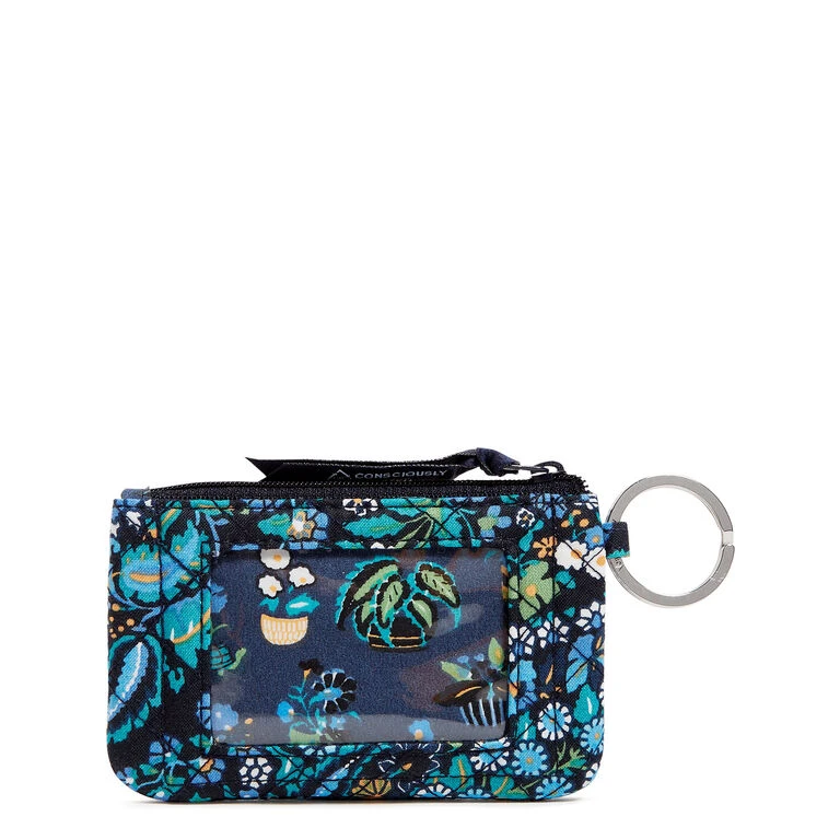 This might be the perfect case for quick errands and travel! Just tuck your cards and cash in the lined interior compartment and zip it closed. Quilted recycled cotton fabric in a black and blue paisley floral pattern is lightweight, making this compact wallet from Vera Bradley a must-have! Convenient front window holds your ID securely. And it includes a large key ring for easy access to your keys.